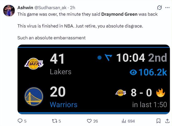 勇媒:在勇士宣布追梦复出的那一刻比赛就结束了,这种病毒在NBA英国彻底消失,他就该退役避免如此严重的尴尬局面。